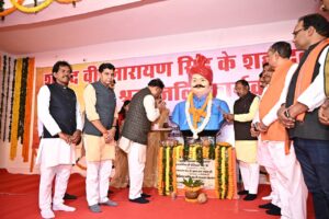 बलौदाबाजार-मुख्यमंत्री श्री विष्णु देव साय 10 दिसम्बर बुधवार को छत्तीसगढ़ क़े प्रथम शहीद वीर नारायण सिंह क़े शहादत दिवस पर उनकी जन्मभूमि एवं कर्मभूमि सोनाखान में आयोजित श्रद्धांजलि कार्यक्रम में शामिल हुए। उन्होंने श्रद्धांजलि कार्यक्रम में शहीद वीर नारायण सिंह के वंशजो को सम्मानित किया। इस अवसर पर मुख्यमंत्री ने 101 करोड़ 44 लाख 53 हजार रूपए के 119 विकास कार्यों का लोकार्पण एवं भूमिपूजन किया जिसमें 25 करोड़ 89 लाख 48 हजार रूपए के 31 विकास कार्यों का भूमिपूजन एवं 75 करोड़ 55 लाख 5 हजार रूपए के 88 विकास कार्यों का लोकार्पण शामिल है। उन्होंने सोनाखान में मुख्यमंत्री ग्रामीण बस योजना अंतर्गत बस सेवा प्रारम्भ करने, सोनाखान में नवीन प्राथमिक स्वास्थ्य केन्द्र भवन निर्माण हेतु 75 लाख, सियान सदन निर्माण हेतु 50 लाख, मड़ई मेला स्थल में शौचालय निर्माण हेतु 20 लाख देने, सोनाखान में इको टुरिज्म विकास एवं सड़क निर्माण हेतु राशि बजट में शामिल कराने की घोषणा की। कार्यक्रम में 10 हितग्राहियों को पीएम आवास ग्रामीण की चॉबी सौंपी गई। इसके साथ ही हम होंगे कामयाब अंतर्गत 37 युवाओं को नियुक्ति पत्र एवं आदिवासी समाज के 5 प्रतिभावान छात्रों का सम्मान किया गया।