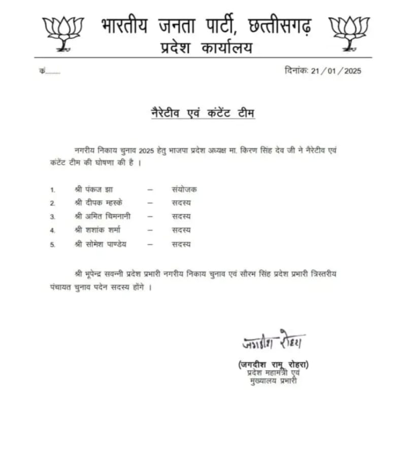 पार्टी का उद्देश्य आगामी चुनावों में स्थानीय स्तर पर मजबूत रणनीति बनाकर जीत हासिल करना है। इसके लिए समिति के सदस्य जल्दी ही अपने दायित्वों का निर्वहन शुरू करेंगे। इसके अलावा बीजेपी ने अपनी नैरेटिव और कंटेट टीम भी तैयार की है। इस टीम की कमान सीएम विष्णु देव साय के मीडिया सलाहकार पंकज झा को सौंपी गई हैं।